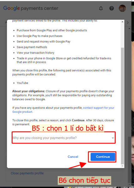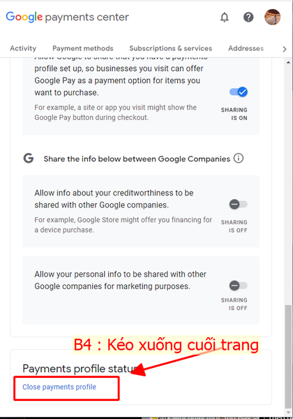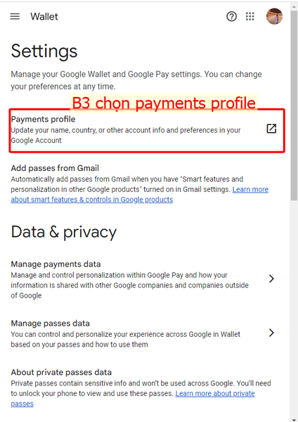 Sau khi hoàn thành bước 1 và khi đi theo đường link bạn vẫn gặp thông báo lỗi khác quốc gia thì sẽ cần truy cập theo đường link này để kiểm tra hồ sơ thanh toán cũ của tài khoản : https://pay.google.com/