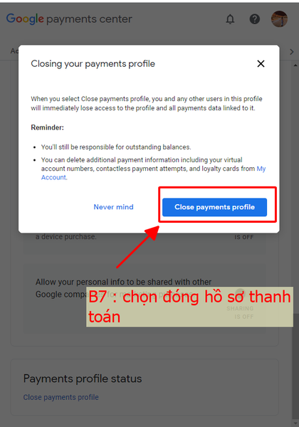 Lưu ý: một tài khoản sẽ có thể có nhiều hồ sơ thanh toán cùng lúc, bạn nên xóa toàn bộ các hồ sơ hiện có trên tài khoản để đảm bảo việc tham gia vào family thành công