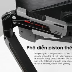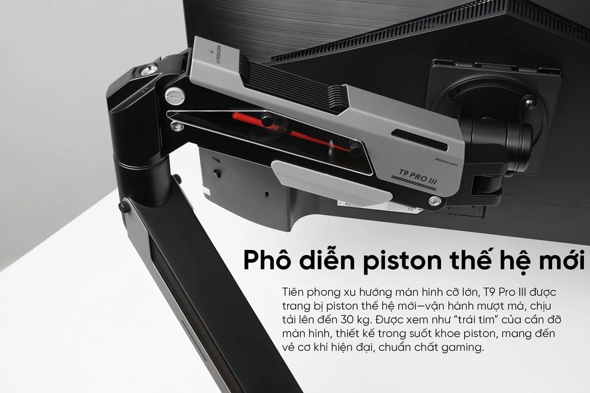 - Thiết kế trong suốt, lộ piston: Một trong những điểm nhấn về thiết kế của T9 Pro Gen 3 là việc sử dụng lớp nhựa trong suốt để lộ ra chi tiết piston bên trong. Điều này tạo cảm giác “hi-tech”, “cơ khí”, rất phù hợp với các setup gaming hoặc những người yêu thích phong cách công nghiệp hiện đại. Nó biến chiếc arm không chỉ là một phụ kiện công thái học mà còn là một điểm nhấn thẩm mỹ trên bàn làm việc.