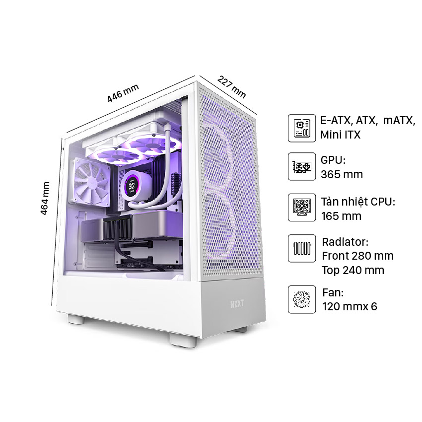 NZXT H5 Flow là lựa chọn tuyệt vời cho người dùng cần một bộ case mid-tower có khả năng làm mát cực tốt, không gian gọn gàng, dễ lắp đặt, hỗ trợ nhiều quạt và tản nhiệt nước. Thiết kế tối giản, hiện đại và luồng gió mát trực tiếp vào GPU giúp tăng tuổi thọ linh kiện và tối ưu hiệu suất khi chơi game hoặc làm việc nặng.