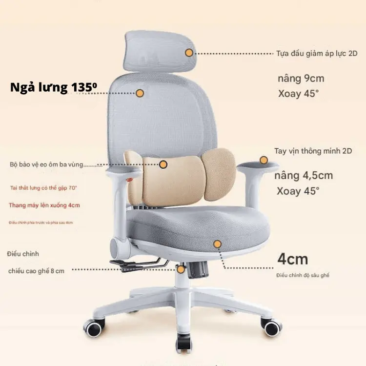 Ghế cho phép điều chỉnh độ cao, độ sâu mặt ngồi, góc ngả và xoay 360 độ. Dễ dàng thích nghi với nhu cầu và thể trạng khác nhau – từ học sinh, sinh viên cho tới dân văn phòng hoặc làm việc tại nhà.